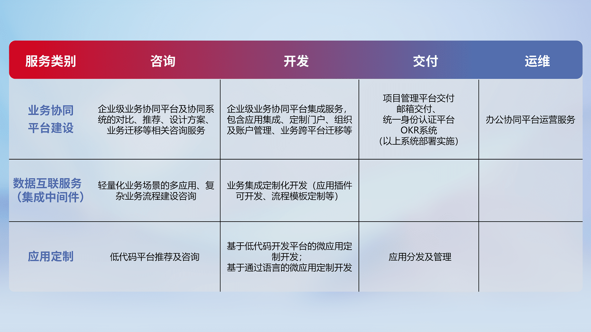 针对钉钉、、企微、、、IDaas等平台级产品提供产品的规划、、、方案、、、交付、、、、定制化开发等服务,,,,实现如统一协同办公、、智能客户服务、、混合会议管理、、、智能数据查询、、、等业务场景,,实现数字化转型。。。